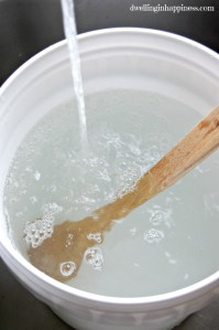 Fill up your bucket all the way to the top with hot tap water, only leaving about 1/2 inch of room on top. Make sure you do this BEFORE adding in your castile soap, or you’ll have a bubbly mess!